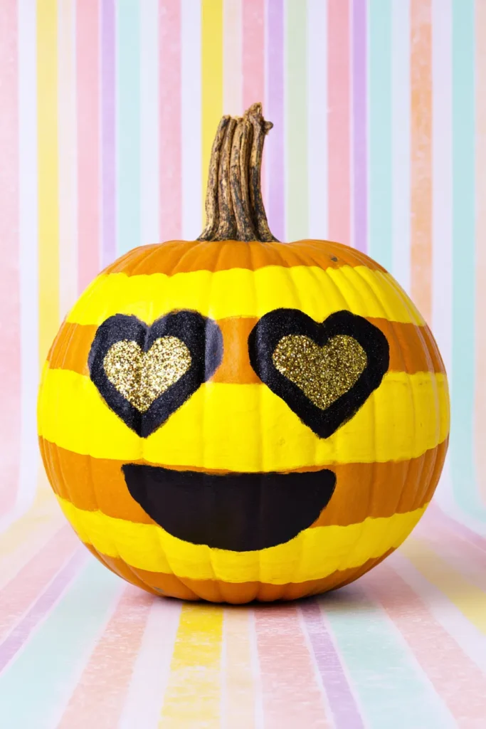 This pumpkin is transformed into the iconic heart-eyes emoji with bright yellow stripes, glittery black-outlined hearts, and a big smiling mouth. The playful design stands out against a pastel striped background, making it look extra cheerful.