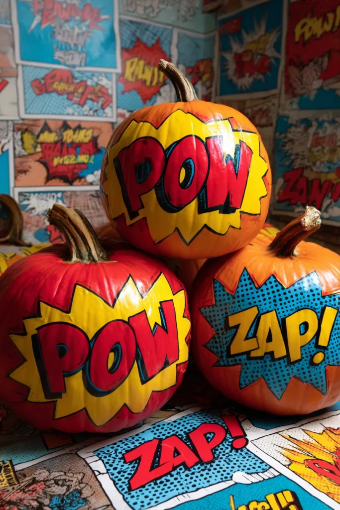 Bold comic book designs cover these pumpkins with words like “POW” and “ZAP” painted in bright yellow, red, and blue. The sharp outlines and big letters make them look like they popped right out of a superhero comic strip.