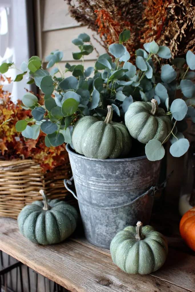 Soft sage green pumpkins are tucked into a galvanized bucket filled with fresh eucalyptus, with more pumpkins scattered around a rustic wooden table. Wicker baskets and autumn leaves complete the look.