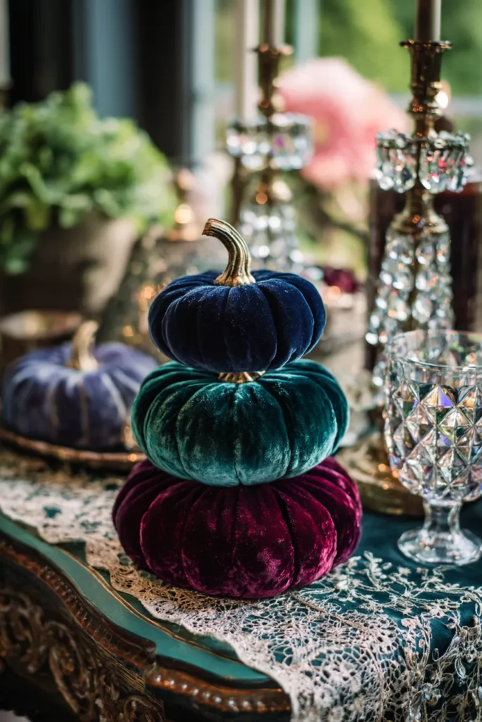 This design features plush velvet pumpkins in deep jewel shades of navy, emerald, and burgundy, stacked neatly on an ornate lace-covered table. Crystal glassware and shimmering candlesticks in the background give the whole look a regal touch.
