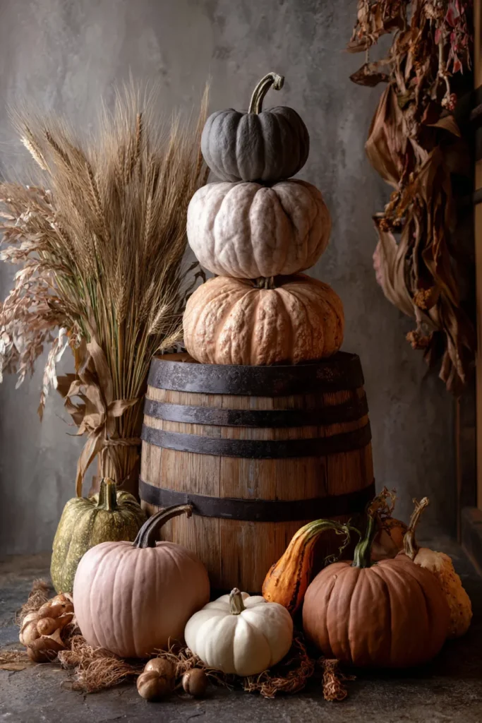 Here a set of muted pumpkins in gray, cream, and soft peach is stacked atop a rustic wooden barrel. Wheat stalks and dried foliage frame the scene, while more pumpkins in earthy tones gather at the base for a complete harvest look.