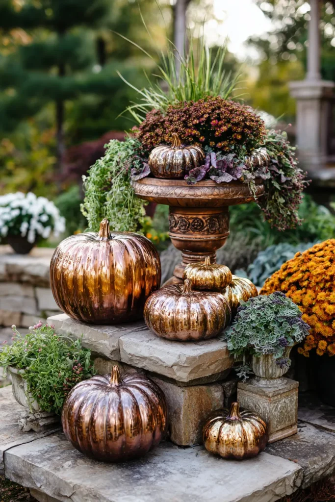 Shiny bronze-toned pumpkins are stacked in a classic garden pedestal overflowing with trailing greenery and seasonal blooms. More metallic pumpkins are scattered around stone steps, catching the light beautifully outdoors.