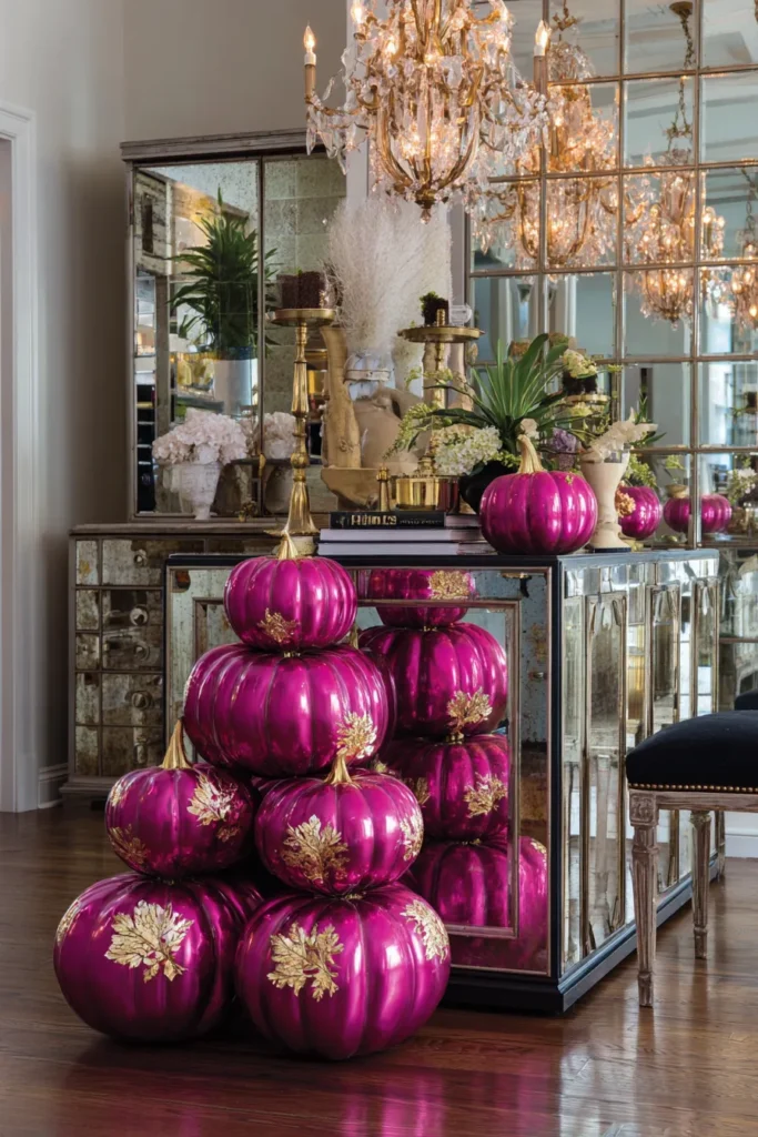 A dramatic stack of glossy hot pink pumpkins with gold leaf accents sits in a glamorous living room with mirrored walls and a sparkling chandelier above. The pumpkins shine like jewels, reflecting the light and adding bold personality to the space.
