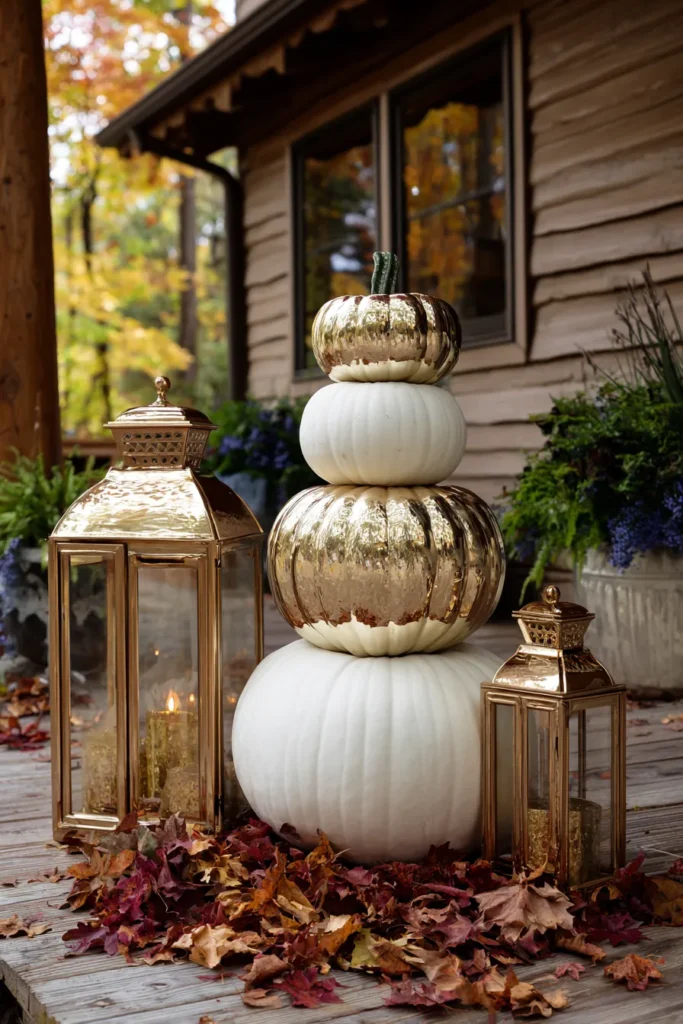This design features a stack of glossy gold and crisp white pumpkins set on a wooden porch, framed with tall gold lanterns glowing with candlelight. The mix of metallic shine and natural textures makes the whole scene look polished yet cozy, especially with the autumn leaves scattered around.