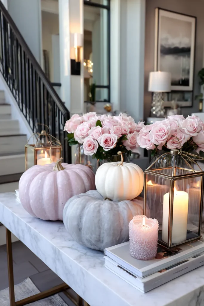 A marble table is styled with soft pastel pumpkins in pink, gray, and white, paired with gold lanterns and delicate pink roses. The whole setup is lit with glowing candles that add warmth to the sleek modern space.