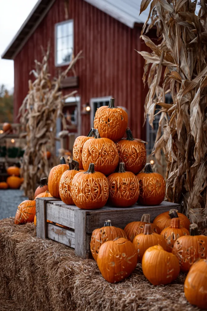 Here a rustic crate holds a perfect stack of hand-carved orange pumpkins, each etched with intricate designs. The whole display sits on hay bales outside a weathered red barn, surrounded by dried cornstalks for that full harvest festival vibe.