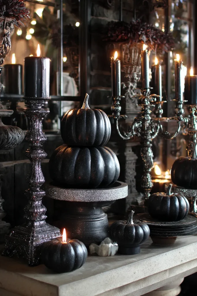 Deep black pumpkins, dusted with shimmer, are stacked on a pedestal and surrounded by tall glittery candlesticks. Black tapers flicker in ornate holders, giving the whole vignette a moody, almost Victorian feel.