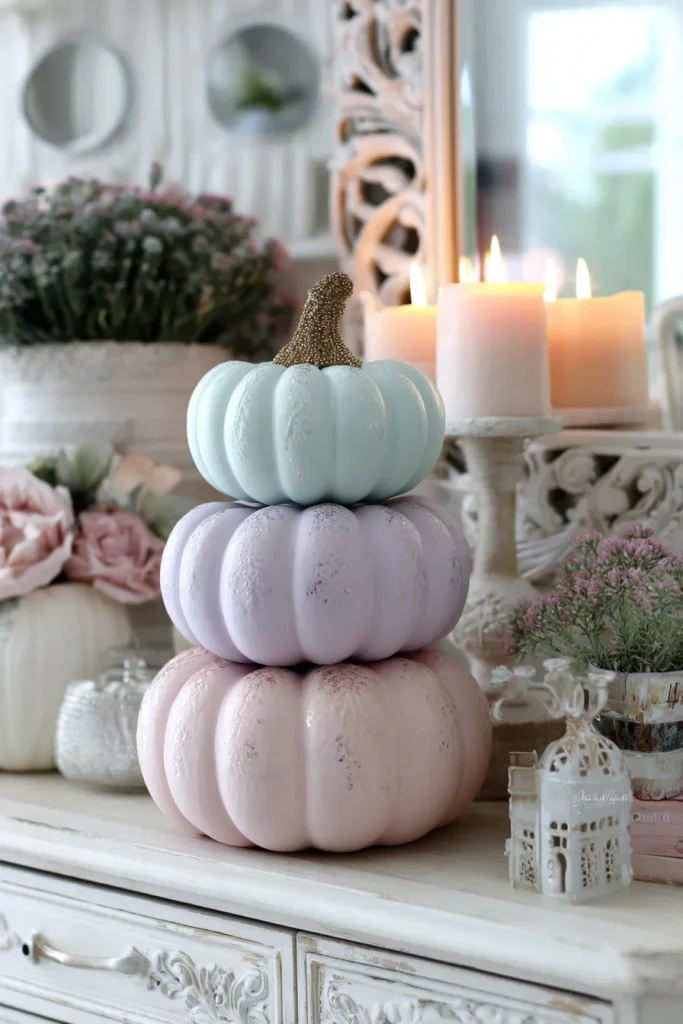 A trio of pumpkins in pale pink, lavender, and mint is stacked neatly on a whitewashed dresser, with glowing white candles and delicate flowers completing the look. Subtle glitter details give the pumpkins a soft sparkle.