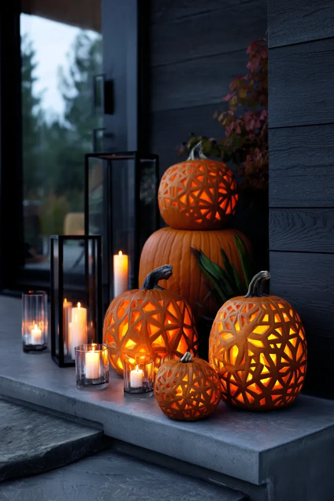Pumpkins with cut-out geometric designs glow warmly from within, stacked alongside sleek glass lanterns and candles. The dark siding of the house makes the golden light stand out even more, giving the whole display a crisp modern feel.