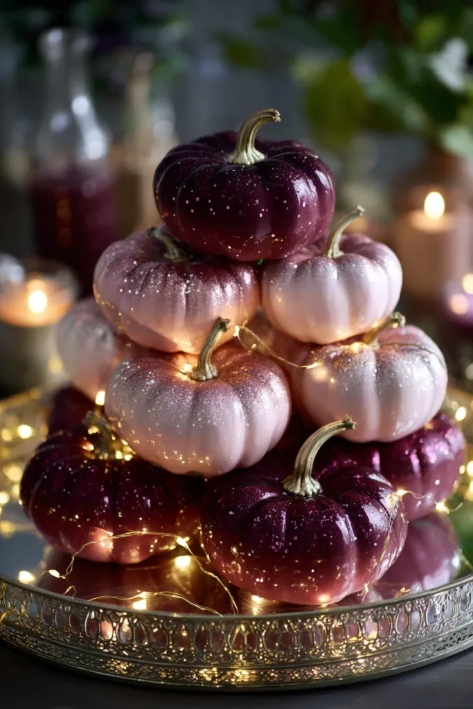 Rich plum and blush pink pumpkins are stacked together on a mirrored tray, wrapped with delicate string lights. The pumpkins shimmer with glitter, creating a jewel-like effect that makes the whole display sparkle.