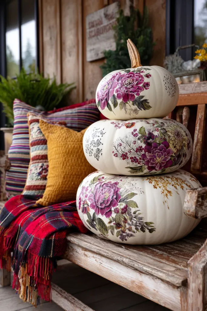 Three creamy white pumpkins are stacked neatly and decorated with bold floral prints in shades of pink, purple, and green. The whole arrangement sits on a weathered bench with cozy plaid blankets and textured pillows nearby.