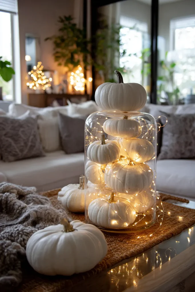 Mini white pumpkins are stacked inside a tall glass cloche, wrapped with twinkling fairy lights. The display rests on a woven coffee table in a neutral living room, surrounded by soft blankets and plush pillows.