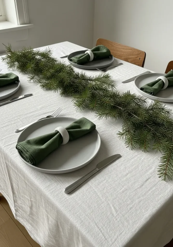 I love how this setup feels both cozy and modern at the same time. The green napkins give that subtle nod to Christmas while the pine garland adds texture and warmth. It’s proof that sometimes less really is more when it comes to table decor.