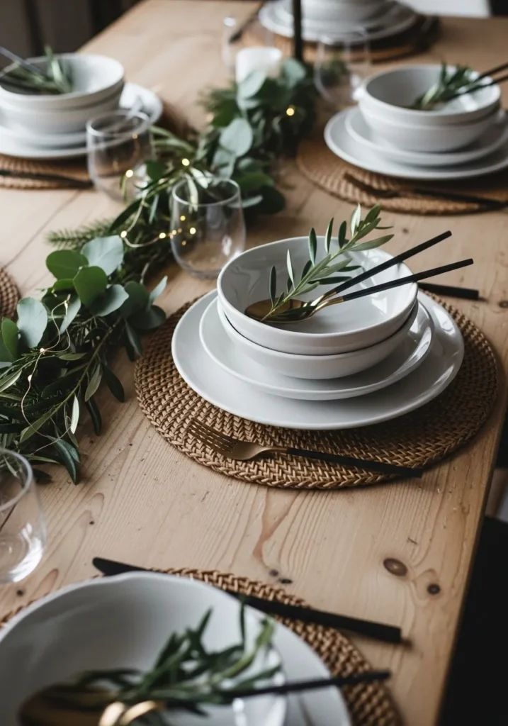 This table has that cozy Nordic charm that never goes out of style. Layered white dishes sit on woven placemats, with soft greenery and twinkle lights weaving through the center. The mix of eucalyptus, fir, and rustic table textures creates a look that’s grounded and graceful.