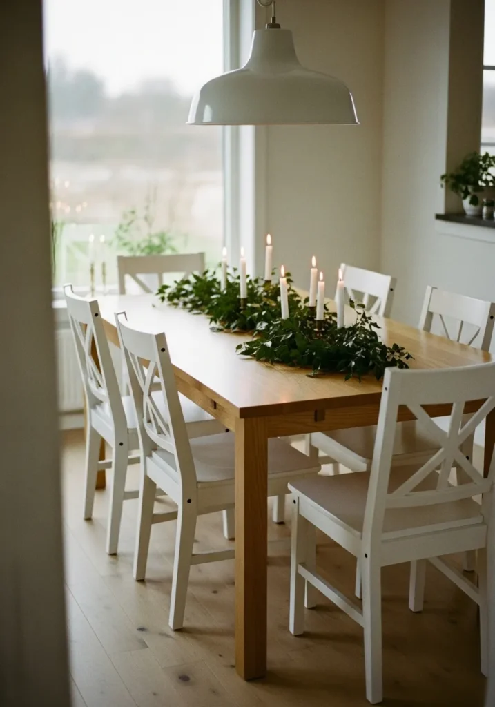 Here’s a table that feels like a page out of a Christmas storybook. A long green garland runs down the center, dotted with tall white candles that glow softly against a backdrop of white chairs and natural light. The whole space feels open, bright, and welcoming.