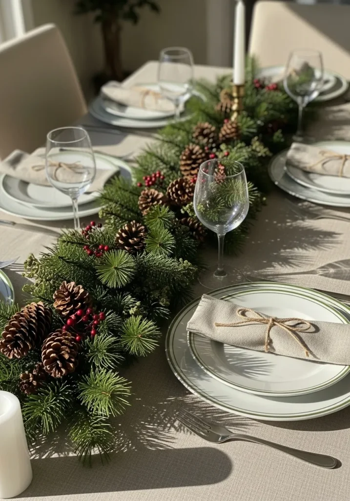 I love how natural this design feels. It’s the kind of table that looks elegant without even trying. The pine branches add just the right touch of Christmas while keeping everything light and simple.