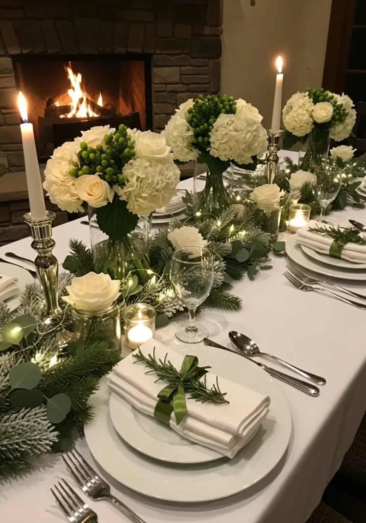 There’s something incredibly cozy about this design. A white tablecloth sets the scene for lush arrangements of white roses, hydrangeas, and greenery, with flickering candles reflecting the glow of a crackling fireplace nearby. It feels intimate, romantic, and oh-so-Christmassy.