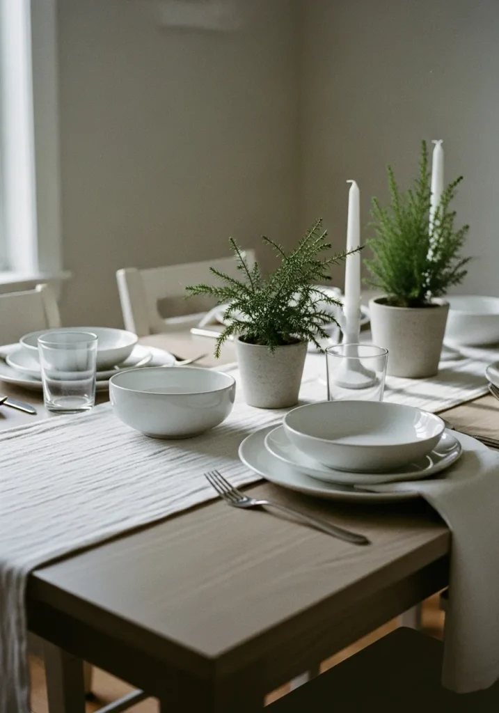 This setup is minimal but so charming. Small potted evergreens line the table, mixed with slender white candles and simple dishware. The natural wood and neutral tones make everything feel clean and calm, perfect for a peaceful holiday meal.