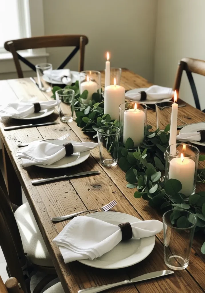 A rustic wooden table, fresh eucalyptus garland, and glowing white candles come together for this effortlessly chic look. The mix of simple white napkins, glass votives, and greenery creates that cozy, inviting feel we all crave during the holidays.