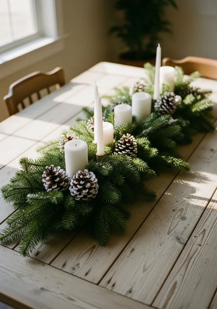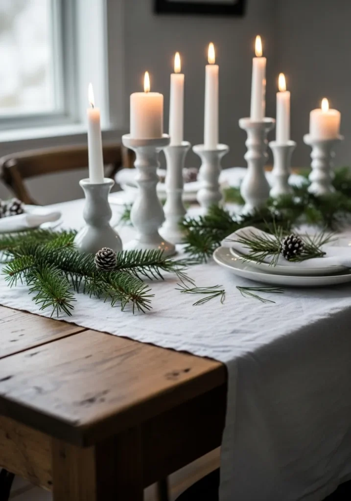 Here’s a look that blends rustic charm with timeless elegance. The wooden table, white linen runner, and clusters of pine branches make a natural base for tall white candles in classic holders. The mix of textures gives it that cozy “gather around the table” feeling.