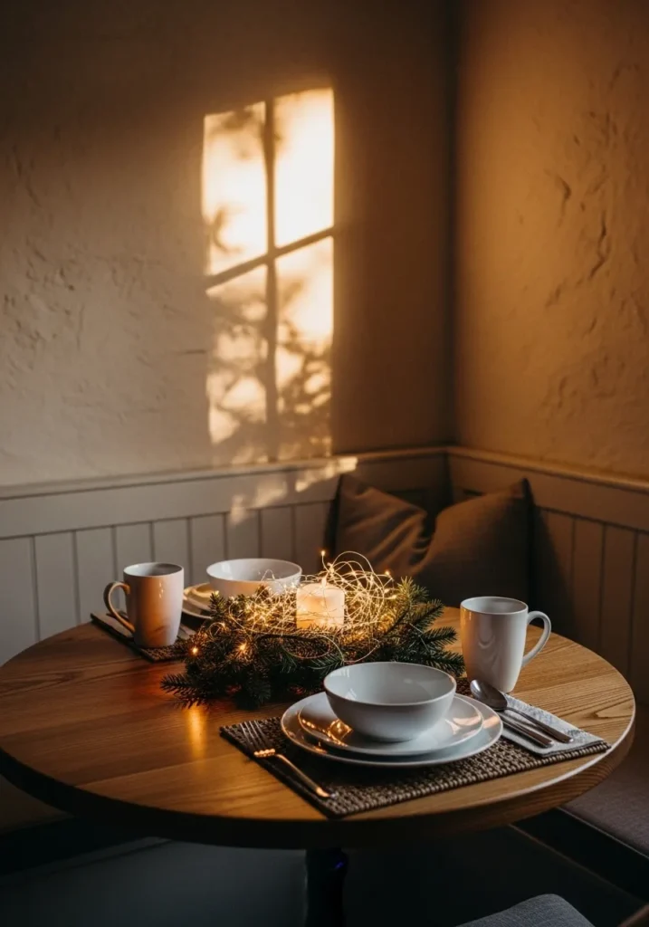 This little round table looks like the perfect place to share a quiet Christmas dinner. The natural wood pairs beautifully with soft greenery, fairy lights, and a glowing candle at the center. The warm evening light spilling through the window gives everything a golden, peaceful glow.