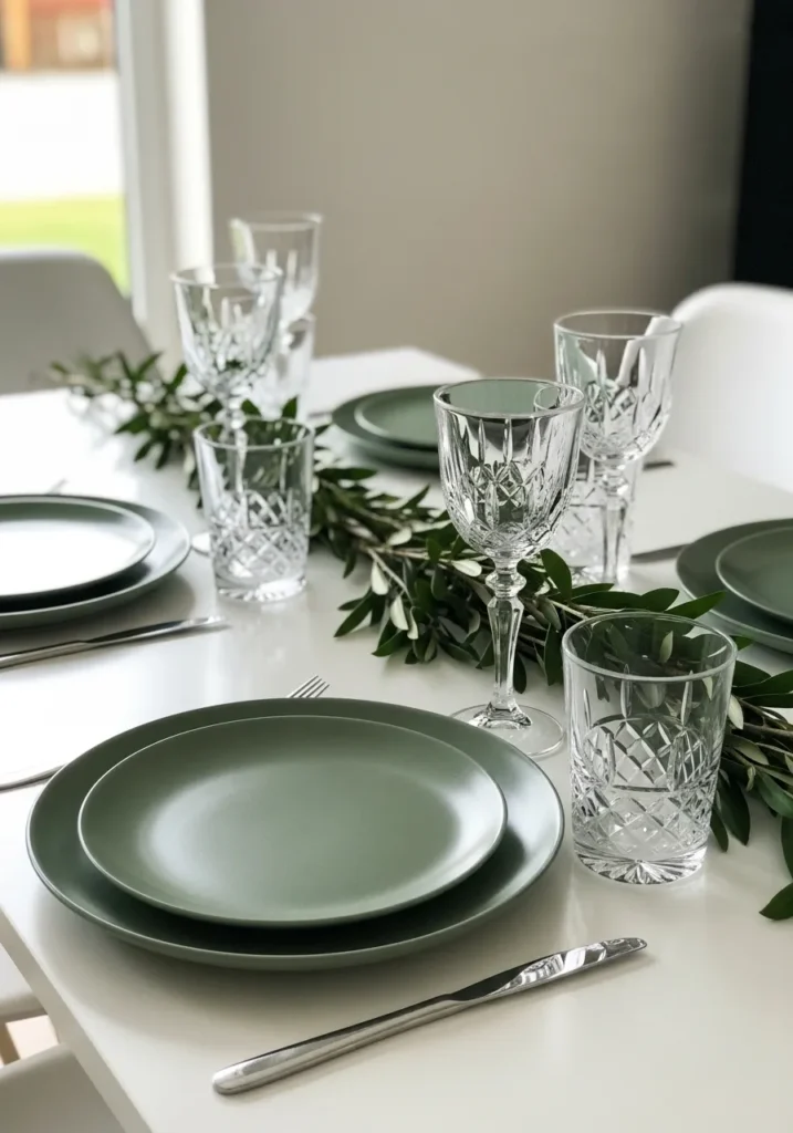This table is a fresh, modern take on Christmas styling. Soft sage plates, crystal glassware, and a delicate green garland make the table feel light, airy, and festive in the most effortless way. The white background helps every detail stand out beautifully.