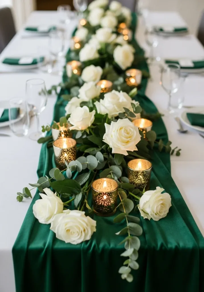 This table is all about rich texture and soft romance. A deep green runner flows through the center, topped with white roses, eucalyptus leaves, and golden votive candles. The combination of emerald, white, and gold feels luxurious while still staying festive and fresh.