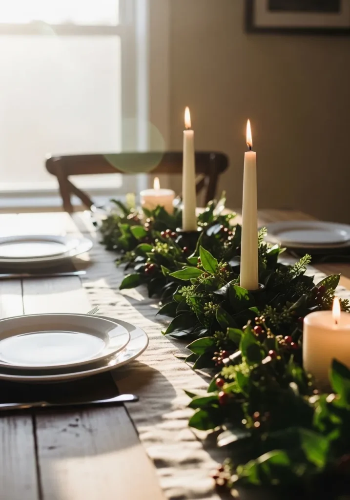 This table captures that classic holiday look with glossy holly leaves, red berries, and tall white candles. The greenery stretches neatly down the table, framing the glowing candles in a perfectly cozy, timeless way.