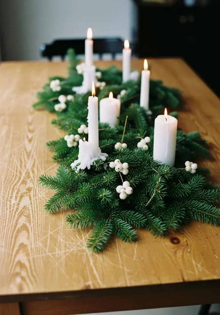 A charming arrangement of white candles surrounded by thick pine branches and tiny white berries creates a snowy, woodsy vibe. The wax drips and slightly uneven candles only make it feel more authentic and cozy.