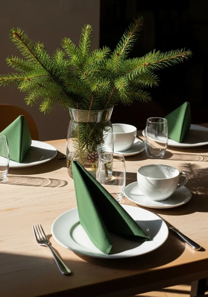 This setup is bright, airy, and beautifully effortless. A clear glass vase filled with fresh pine branches takes center stage, surrounded by crisp white dishes and folded green napkins. The sunlight streaming across the wooden table adds a soft golden warmth that makes the space feel both festive and calm.