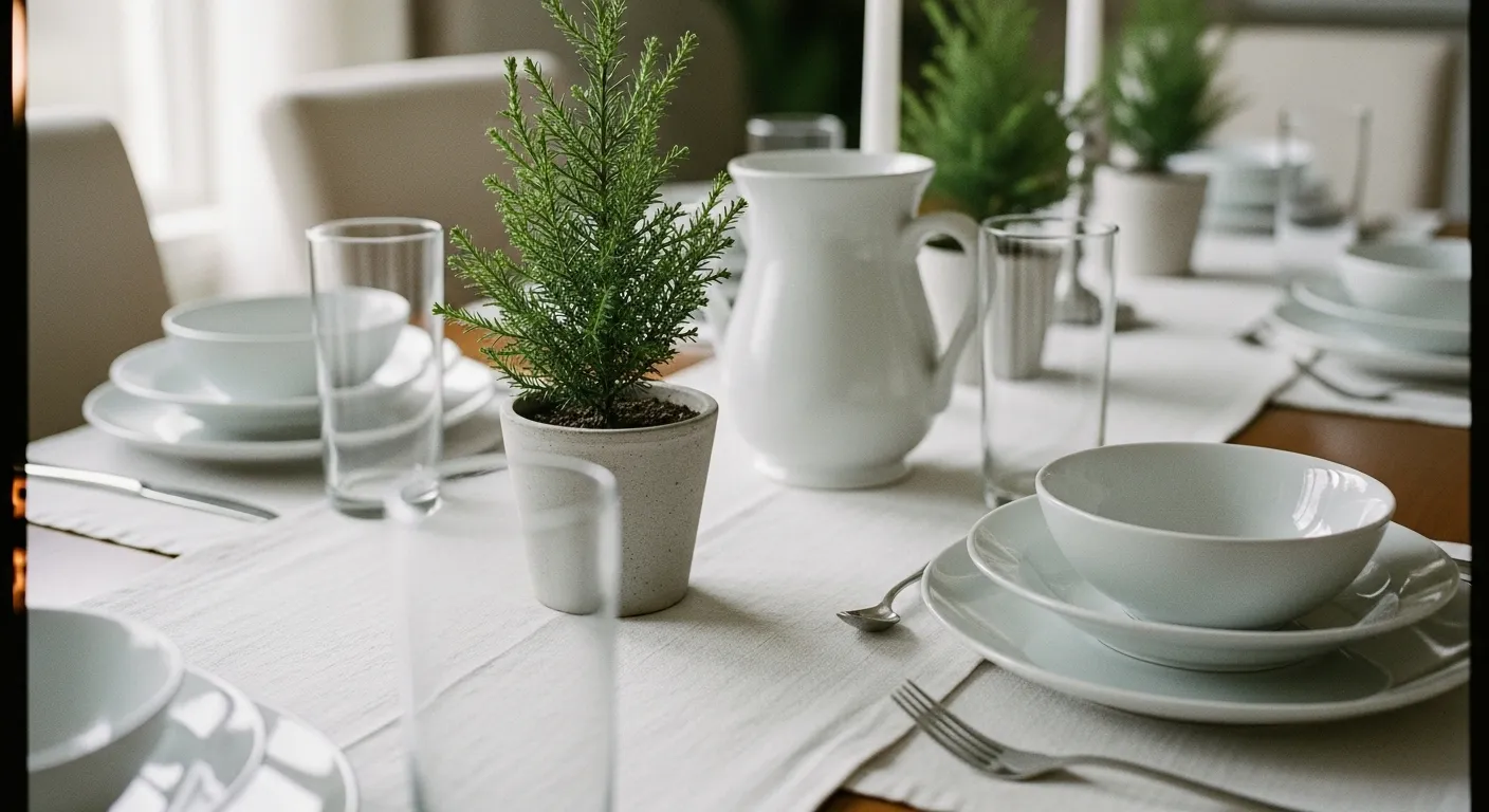 This setup is minimal but so charming. Small potted evergreens line the table, mixed with slender white candles and simple dishware. The natural wood and neutral tones make everything feel clean and calm, perfect for a peaceful holiday meal.