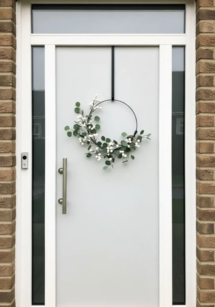 This delicate wreath is all about simplicity done right. A thin black metal ring holds a half-circle of eucalyptus sprigs and soft white berries, creating a design that feels fresh, airy, and effortlessly stylish. The mix of muted greens and crisp whites gives it that modern Scandinavian vibe everyone loves during the holidays.