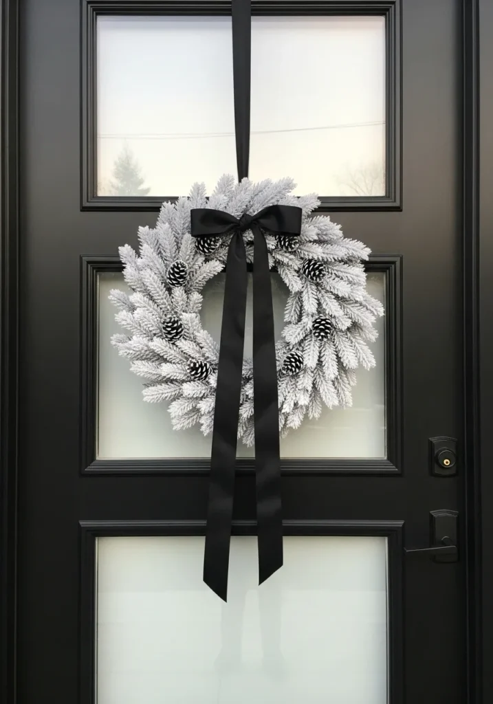 This stunning snowy wreath looks like it came straight from a designer catalog. The frosted pine branches, delicate black-and-white pinecones, and that sleek black satin ribbon all come together to create an effortlessly elegant statement. It’s full but never fussy.