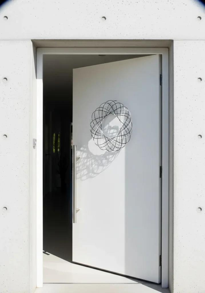This asymmetrical wreath made of frosted white pine branches gives modern minimalism a festive twist. Arranged in a swirl pattern, it creates a sense of movement that feels fresh and dynamic. The soft white against the black door feels perfectly balanced and timeless.