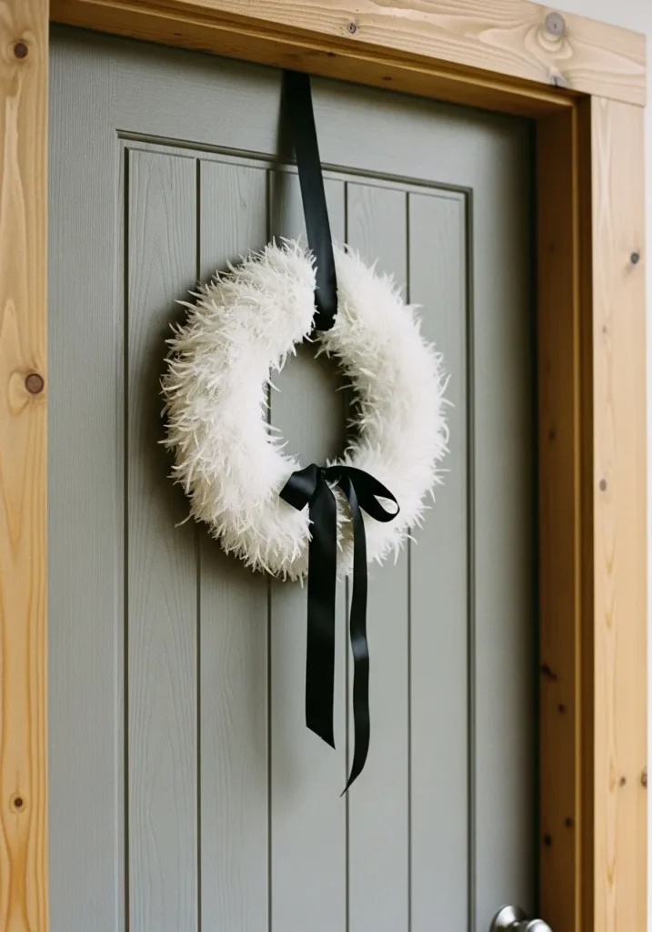 This fluffy white wreath feels like a snowflake you could touch. Made from soft, feathery strands, it’s light and textured, giving off the dreamiest winter vibe. The black ribbon adds a touch of contrast and sophistication.