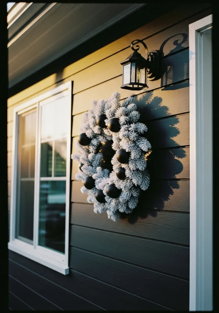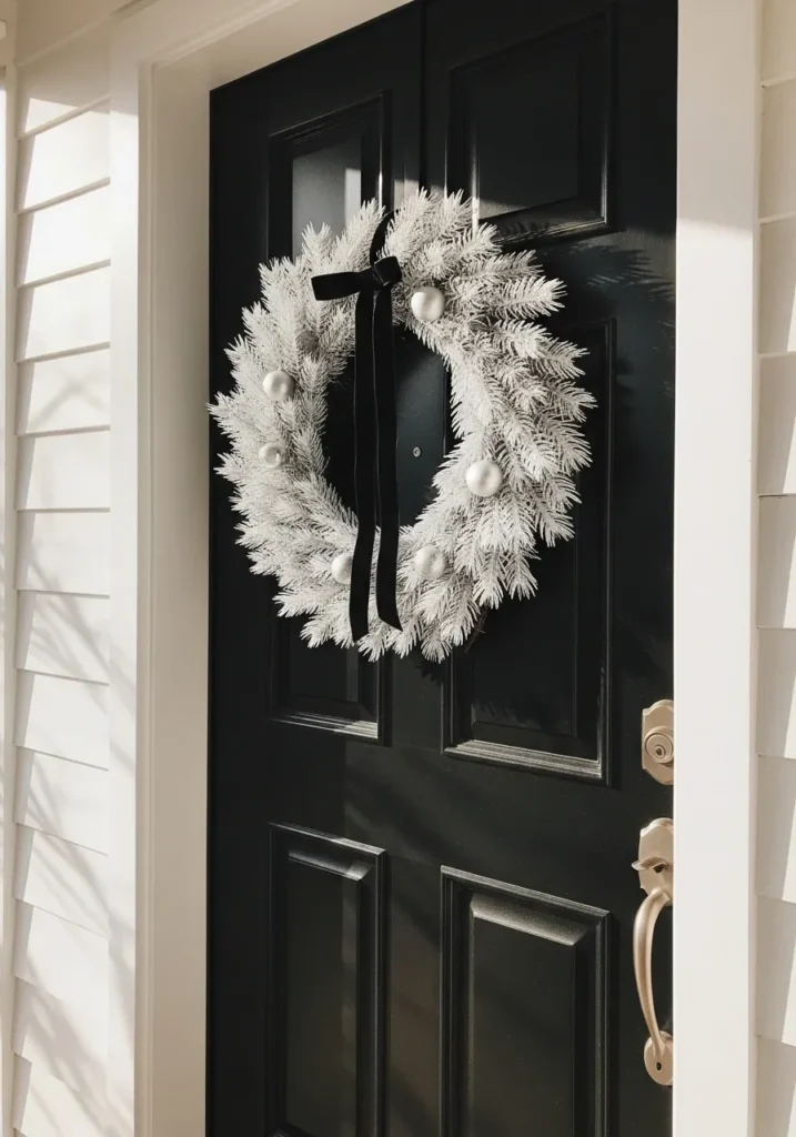 This frosted pine wreath sprinkled with silver ornaments captures the essence of minimal holiday beauty. The snowy texture, paired with a slim black velvet ribbon, gives it a calm, luxurious feel that never feels overdone.