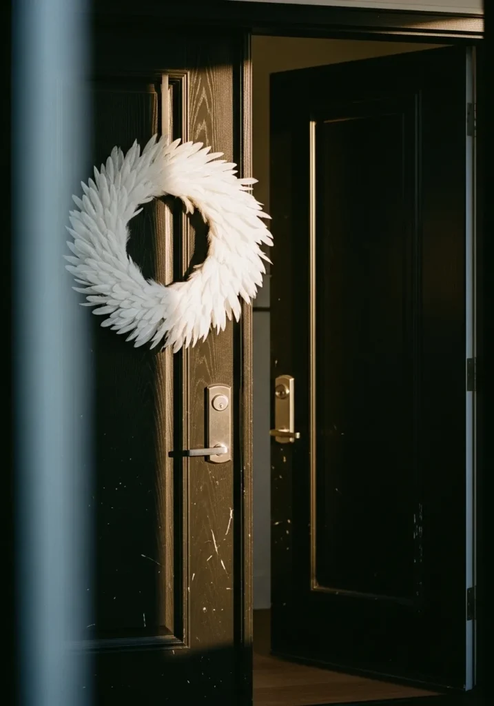 There’s something almost ethereal about this feather wreath. Layers of fluffy white feathers form a full, cloud-like circle that feels light, dreamy, and effortlessly elegant. It catches the light beautifully, creating a soft shimmer that feels perfect for the season.