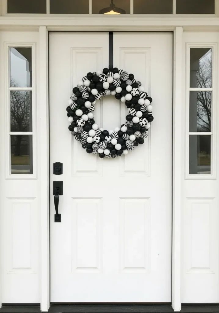 This playful black and white ornament wreath is modern Christmas decor at its finest. Filled with glossy and matte baubles in different sizes and patterns, it creates the perfect statement piece that feels bold but balanced. The high-contrast mix of textures keeps it interesting from every angle.