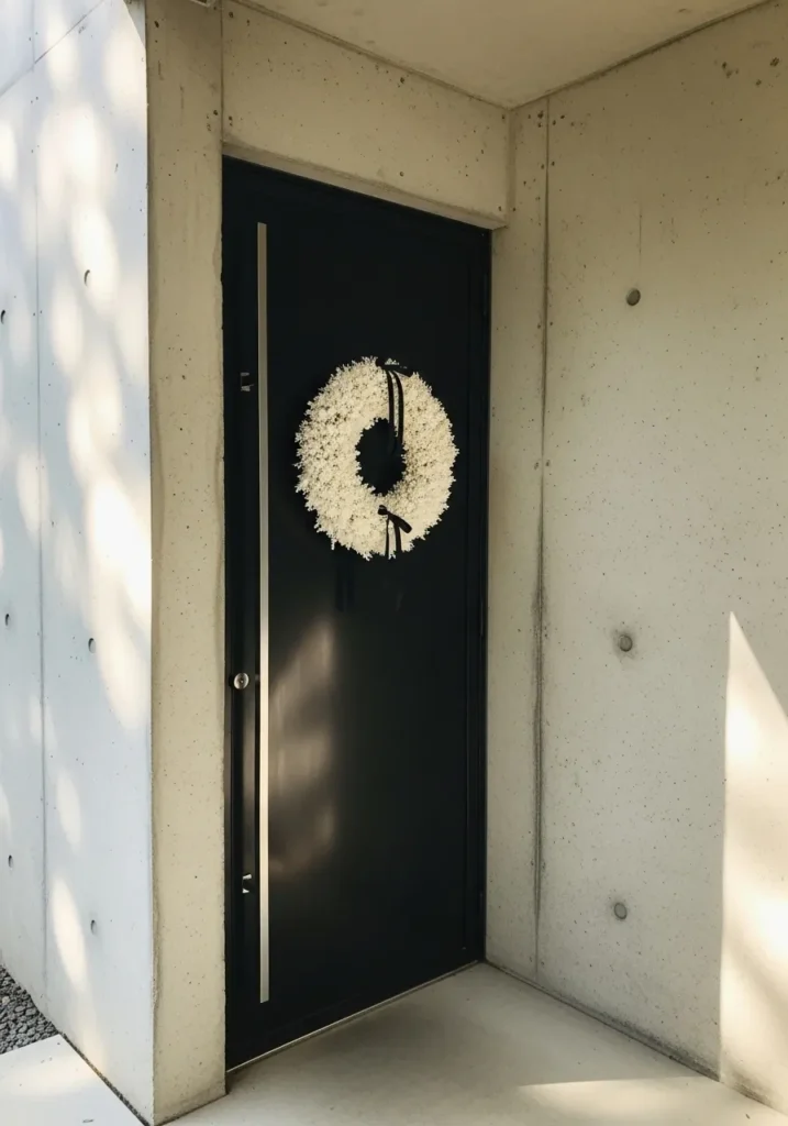 What draws me in is the balance — that soft snowy texture paired with a sharp black accent. It’s the kind of wreath that makes minimalism feel full of personality.