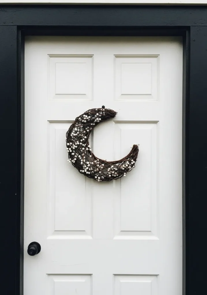 This crescent-shaped wreath made of dark twigs and tiny white berries is the perfect mix of rustic and refined. The crescent moon shape gives it a unique, artistic flair while keeping things minimal. The berries add just the right touch of winter sparkle.