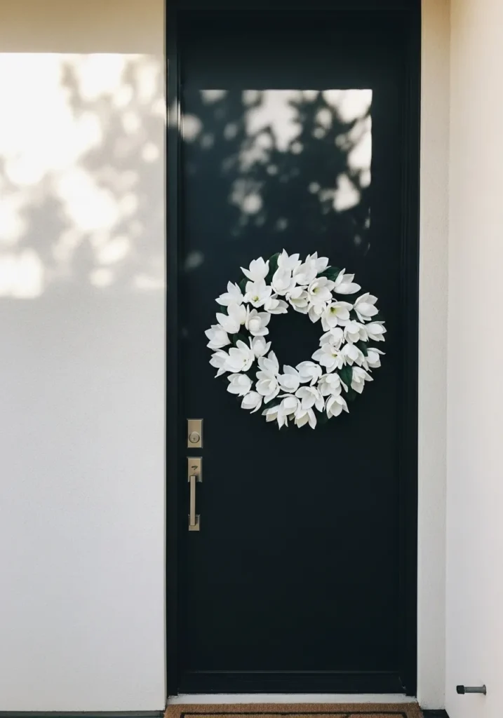 What makes this wreath so captivating is how it feels both modern and classic at the same time. The white-on-black contrast is simply gorgeous, and the florals add that hint of softness every front door deserves.