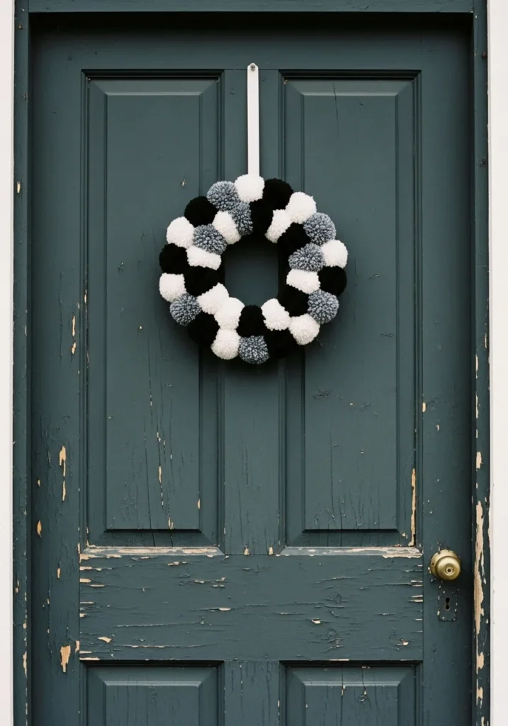 This wreath feels playful and handmade in the best possible way. Made entirely of fluffy pom poms in shades of black, white, and gray, it has that cozy, wintery texture that instantly softens any space. The round, cloud-like shape adds warmth and whimsy while keeping the look minimal and modern.