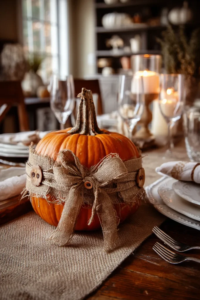 A natural burlap ribbon is tied around this pumpkin with wooden buttons and a big bow, giving it a cozy farmhouse feel. Set on a dining table with candles and fall place settings, it blends perfectly with rustic decor.