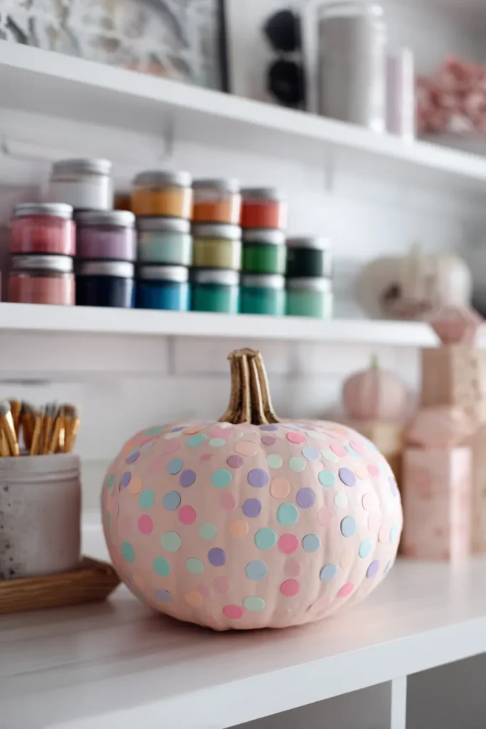 Painted in a soft blush pink, this pumpkin is decorated with pastel polka dots in shades of lavender, mint, peach, and aqua. The playful dots cover the entire surface, giving it a sweet and whimsical vibe, especially when placed in a craft space with colorful paints and brushes nearby.