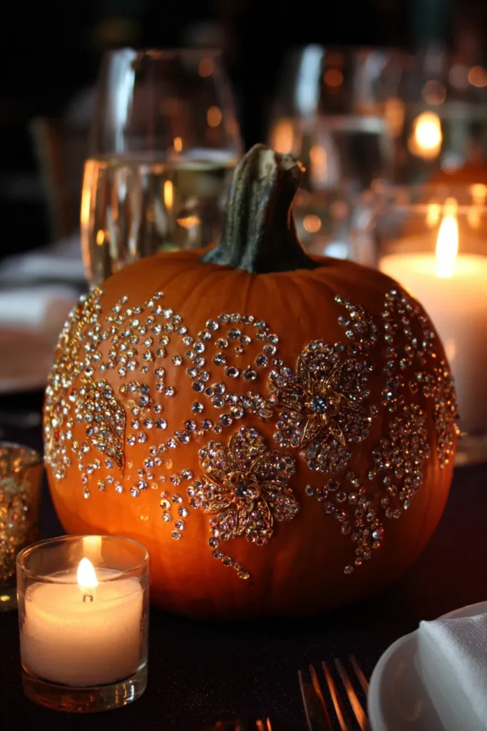 This pumpkin is adorned with sparkling rhinestones arranged into floral and swirling patterns. The intricate jewel work shimmers under candlelight, making the whole design glow with elegance and sophistication.