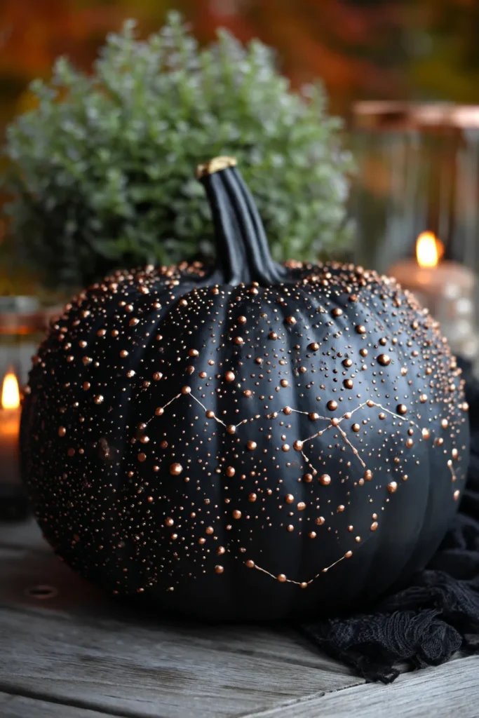 Painted in matte black, this pumpkin is covered in tiny metallic copper dots, forming constellations across its surface. The dotted design creates the illusion of a glowing night sky, especially when placed among candles.
