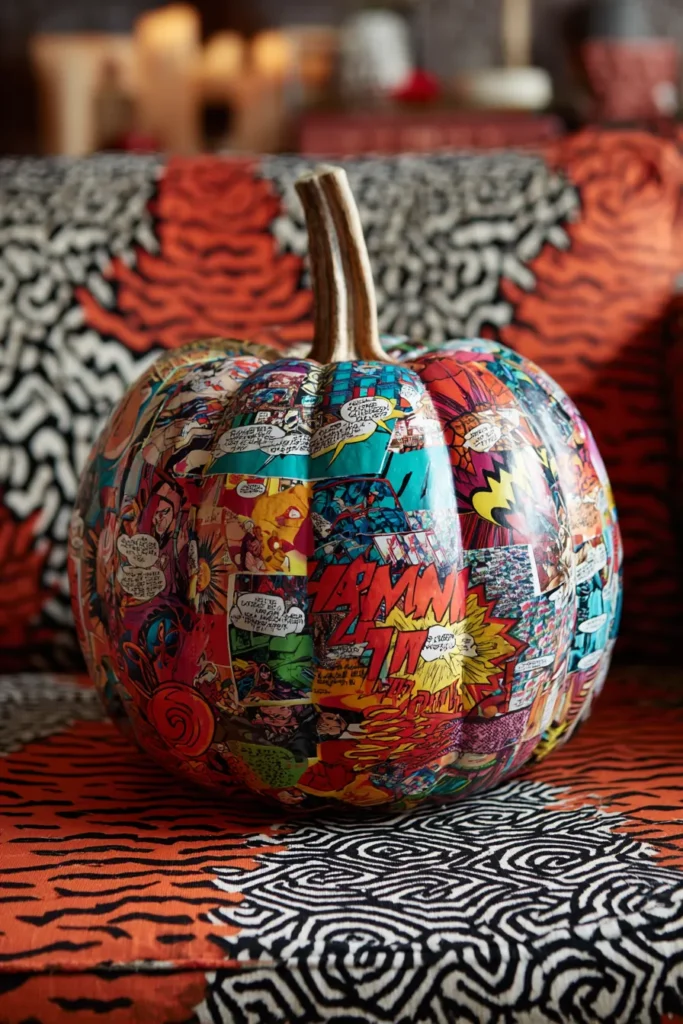 This pumpkin is completely wrapped in vibrant comic book cutouts, featuring bold colors and dynamic illustrations. The glossy surface and overlapping designs give it an eye-catching, pop-art effect.
