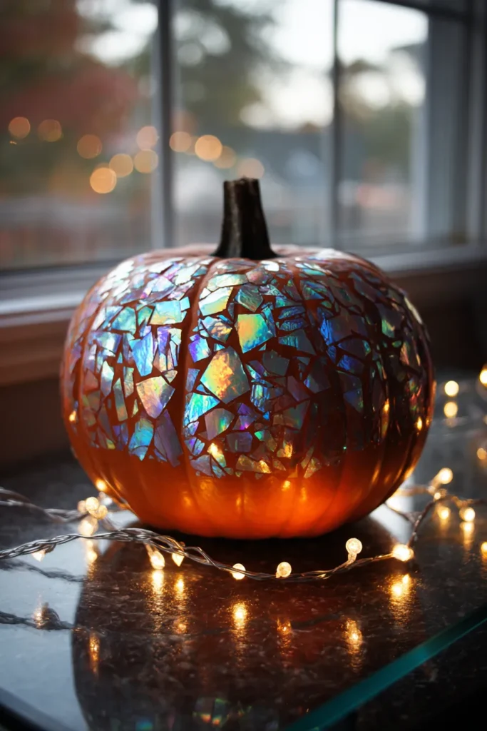 Decorated with shards of iridescent material, this pumpkin has a glowing mosaic effect. The pieces shimmer in shades of blue, purple, and green, reflecting the light beautifully like stained glass.