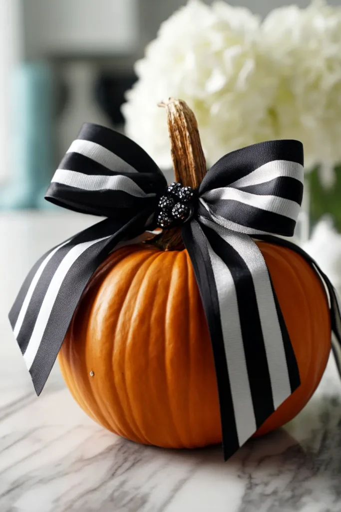 This pumpkin is dressed up with a bold black-and-white striped ribbon tied into a large, elegant bow at the stem. A jeweled accent in the center of the bow adds a touch of sparkle, making the design feel both stylish and festive. The crisp contrast of the ribbon against the pumpkin’s warm orange surface gives it a polished, high-end look.