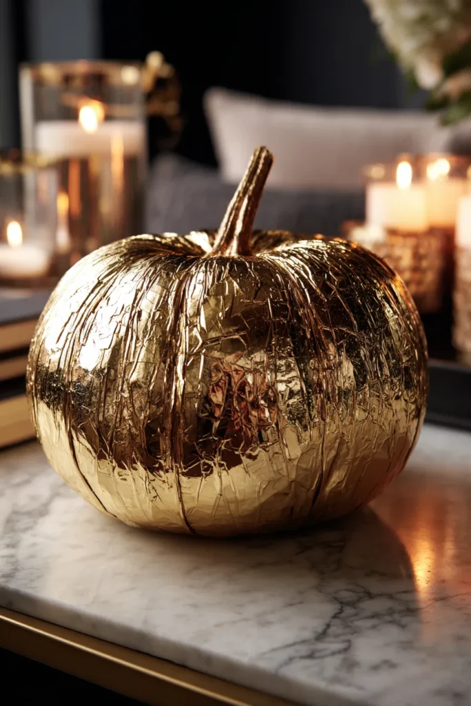 This pumpkin is covered in shiny gold foil, giving it a metallic, high-end look that feels both festive and luxurious. The crinkled texture of the foil catches the light beautifully, while the smooth marble surface underneath adds to its elegant display. Surrounded by soft candlelight, the setup feels warm and polished, perfect for a sophisticated fall centerpiece.